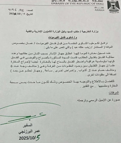 وكانت إدارة فندق الشهير من فئة الخمس نجوم في منطقة الدوار الخامس بالعاصمة عمّان تقدمت بشكوى إلى سفارة إحدى الدول العربية ضد السيدة التي عرّفت عن نفسها بأنها دبلوماسية، بتهمة سرقة موجودات من غرفة أقامت فيها .