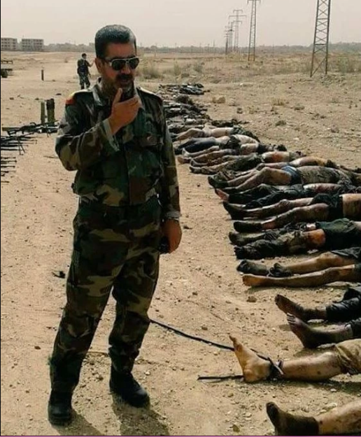أحفاد القرامطة يشعرون بلذّة ونشوة وسط أجواء الموت والقتل والدماء والتمثيل بالجثث وحرقها. وتستهويهم الاستعراضات والتقاط الصور في تلك الأجواء, للتنفيس عن نفوسهم المريضة التي أكلها الحقد على المسلمين. وفي الصورة التالية يظهر اللواء المجرم(غسان اسكندر طراف), وقد فرغ لتوّه من إزهاق أرواح العشرات من الأنفس البريئة في واحدة من مجازره في محافظة دير الزور. وخلفه يظهر أحد جنوده وهو يقوم بعدّ جثث الضحايا, والتي تظهر علامات التعذيب واضحة عليها. وهنا يعطي(تمام خبر)لرؤسائه ليحصل على المكافأة!!.