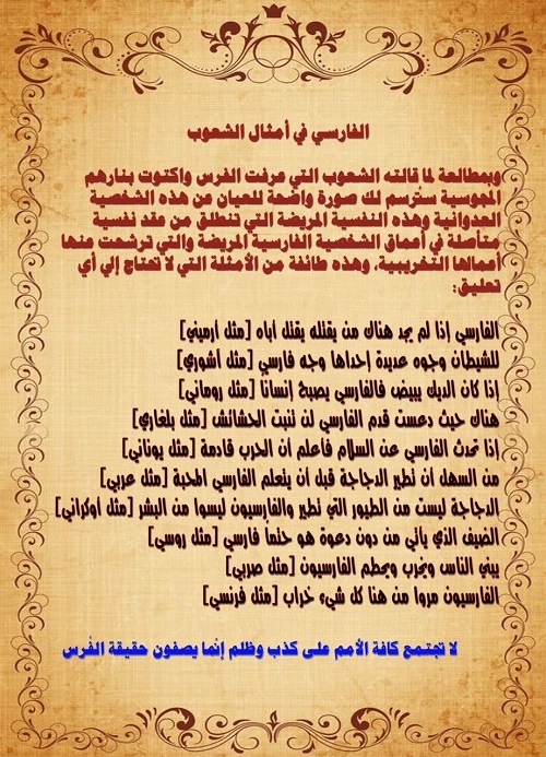 لا توجد مِلّة على وجه الأرض أكثر خبثًا ولؤمًا من الفرس المجوس. وقد ابتُليت الأقوام المجاورة بشرورهم عبر آلاف السنين. ومنذ تأسيس الدولة الصفوية في إيران عام 1500, تبعهم معظم الشيعة في الدول المجاورة, بموجب عقيدة دينية مغرقة بالحقد والعدوانية والتكفير. وقد انعكس ذلك على الأمثال التي قيلت عنهم, من قبل كثير من الأمم والشعوب.