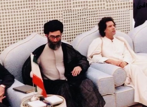 من اليمين الرئيس المرحوم معمر القذافي وبجانبه على خامنئي عندما كان رئيساً للنظام الأيراني، أعتقد لاداعي للشرح ،فعندما شعر الأخير غير مرحب به نهض و غادر دون أن يودعه القذافي!!.