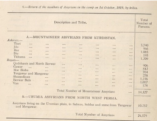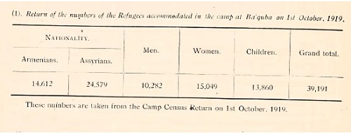 لقد سمع الجميع عن السنوات الأخيرة، عن القمع المستمر للأرمن، وتشهد مذابحهم العديدة على مذابح عامي 1895 و1896 التي عانوا منها على أيدي الأتراك، وأخيرا وليس آخرا، ذبحهم الأخير خلال هذه الحرب على أيدي الأتراك والأكراد والفرس. لقد كان تاريخهم قصة طويلة من سفك الدماء والبؤس بلغت ذروتها، خلال الحرب العالمية، بطردهم من بلدهم وتشتتهم في جميع أنحاء العالم كمنبوذين. من بين الأربعة عشر ألفا من الأرمن الذين أخذناهم تحت جناحنا واستوعبناهم في الأراضي المحتلة، جاء ما يقرب من ثلاثة أرباعهم من بحيرة وان وبيتليس. أما الآخرون فهم بقايا غريبة من الأمة، تم التقاطها من أجزاء مختلفة من الإمبراطورية العثمانية، وتركزت في ولاية الموصل وأرسلت إلى هذا المعسكر. أدناه مخطط توزيع وأعداد الأرمن كما كانت في 1 أكتوبر 1919. وكما هو واضح إن أعداد الأرمن الكلي كان 14612الف مقابل 24679 ألف أثوري.