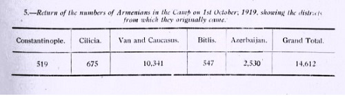 جدول يبين أعداد الأرمن في معسكر بعقوبة بتاريخ 1 تشرين أول 1919 والمناطق التي جاءوا منها