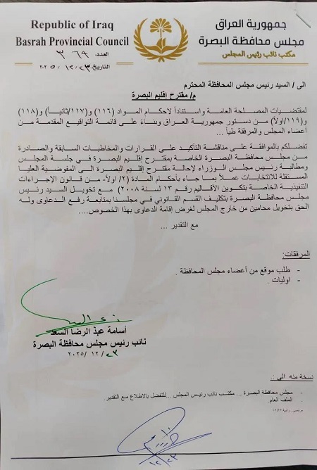 وطلب السعد، وفق الكتاب الرسمي المقدم إلى رئيس المجلس، مناقشة وتأكيد القرارات السابقة المتعلقة بمقترح إقليم البصرة، ومطالبة رئيس مجلس الوزراء بإحالة المقترح إلى المفوضية العليا المستقلة للانتخابات.