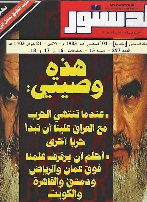 وفي سنة 1983, نشرت مجلة(الدستور)على غلافها وثيقة مهمة ودامغة, وهي وصية المجرم الدجال(خميني)لأتباعه, يقول فيها؛(عندما تنتهي الحرب مع العراق, علينا أن نبدأ حربَا أخرى. أحلم أن يرفرف علمنا فوق عَمّان والرياض ودمشق والقاهرة والكويت)!!. وبعد أشهر من النصر العراقي العظيم في 8-8- 1988, قضى هذا المجرم اللعين كمدًا بكأس السمّ العراقي. ولكن بعد عشرين عامًا حقّق له أتباعه ما(حلم)به قبل هلاكه!!.