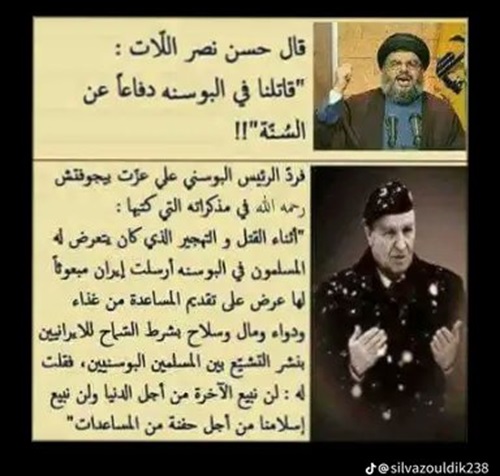 وعن مزاعم وتخرّصات الدجال الصغير(حسن نصر اللات), بأنه؛(قاتل في البوسنة دفاعا عن السُنّة)!, دحض الرئيس البوسني(علي عزت بيجوفيتش)
