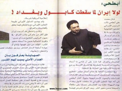 وفي محاضرة له في(مؤتمر الخليج وتحديات المستقبل), الذي عقد في أبوظبي سنة 2004, قال نائب الرئيس الإيراني؛محمد على أبطحي, إن بلاده قدّمت الكثير من العون للأمريكيين فى حربيهم ضد أفغانستان والعراق, واعترف بكل وقاحة وصلافة, بما يلي؛(لولا إيران لما سقطت كابول وبغداد)!!. وهذا التصريح هو اعتراف صريح, بأن إيران الخمينية هي أداة يستخدمها الغرب وربيبته إسرائيل لتحقيق أغراضه التي يعجز هو عن بلوغها. وأن ما يجمعهما أكثر بكثير مما يفرّقهما.