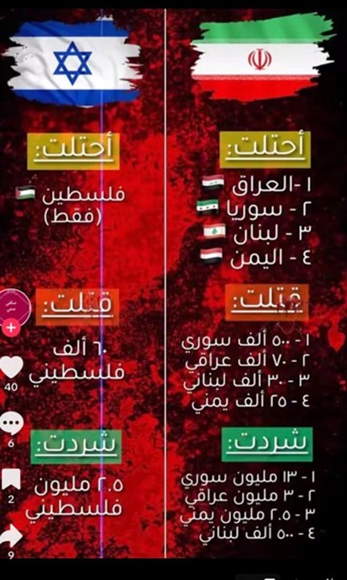 لقد سيطرت إيران في أقل من عشرين سنة على أربع دول عربية مهمة, بالإضافة لقطاع غزة, ونصّبت حثالاتها أو أتباعها لحكم تلك البلدان. بينما إسرائيل خلال(77)سنة لم تستطع التمدّد خارج الـ(27)ألف كم2, وهي مساحة كل أرض فلسطين التاريخية. وهذا بخلاف احتلالها للأحواز والجزر العربية الثلاث في الخليج العربي, سابقا. وهي قد قتلت من الفلسطينيّين والعرب في 40 سنة, أكثر ممّا قتلته منهم إسرائيل بمئات المرات في 100 سنة!!.