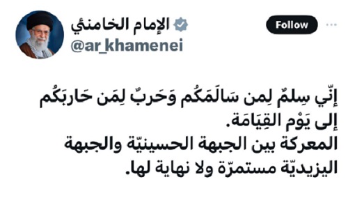 وهذا الكلام الذي عمره قرن من الزمان, عبّر عنه الدجال(خامنئي)بمنشور له سنة 2025, يؤكد فيه إن حربه ليست ضد إسرائيل ولا أمريكا, بل مع السُنة, الذين وصفهم بـ(جبهة يزيد), وإنها مستمرة ولا نهاية لها!!. وفي الاتجاه نفسه صرّح(علي باقري كني)وزير الخارجية الإيراني بالإنابة في 13-6-2024, خلال مؤتمر صحفي مشترك مع قاسم الأعرجي:(خلافنا مع أميركا يرجع للحصة التي خصّصوها لنا.. نحن لم نقبل بذلك، ونسعى للحصول على حصتنا في المنطقة)!!.