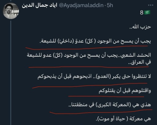 وكلام المجرم الدجال(خامنئي)الذي أوردته آنفًا, وجد له صدىً لدى فضلاته وحثالاته من الشيعة الأعراب الأشدّ كفرًا ونفاقا. فقد كتب المعمم(العلماني)؛أياد جمال الدين, المقيم في أمريكا, ما نصّه؛(حزب الله.. يجب أن يمسح من الوجود كل عدو داخلي للشيعة. الحشد الشعبي يجب أن يمسح من الوجود كل عدو للشيعة في العراق. لا تنتظروا قبل أن يكبر العدو.. اذبحوهم قبل أن يذبحوكم, واقتلوهم قبل أن يقتلوكم. هذه هي المعركة الكبرى في منطقتنا.. هي معركة حياة أو موت)!!!.