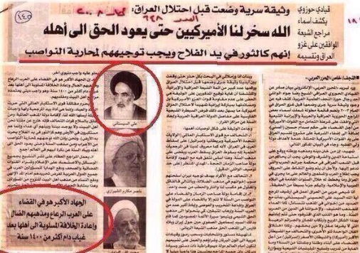 وفي وثيقة مسّربة, وقعها(36)من كبار(حاخامات)الشيعة في(حوزة النجف)قبيل غزو واحتلال العراق بقليل, نشرتها جريدة(المحرر العربي) بعددها(648)في أيار 2008, يشيرون فيها إلى إن؛(الله سخّر لنا الأمريكان ليعيدوا الحق إلى أهله.. إنهم كالثور بيد الفلاح ويجب توجيههم لقتال النواصب)!!. وفي الوثيقة نفسها, يقول المعمّم الإيراني محمد تقي يزدي؛(الجهاد الأكبر هو القضاء على هؤلاء الرعاع العرب ومذهبهم الضال وإعادة الخلافة المسلوبه إلى أهلها بعد غياب دام 1400 عام)!!.