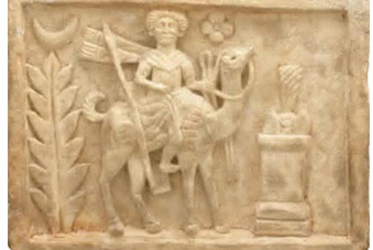 الإله العربي ارصو أو ارسو (Arsu) أو روضى (Ruḍā) يمتطي جملا ويقترب من مذبح