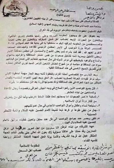 هذه وثيقة مسرّبة صادرة عن ميليشيا قيس الخزعلي تعود لبداية سنة 2014, وتم نشرها قبل سنوات. تتضمن خطة مفصّلة للقضاء على أهل السُنّة في العراق؛ قتلًا أو تشييعًا أو تهجيرا, وهي على شاكلة(بروتوكولات حكماء صهيون). والواقع أثبت إن ما وقع على الأرض خلال العشر سنوات الأخيرة, هو تطبيق حرفي لبنودها!!.