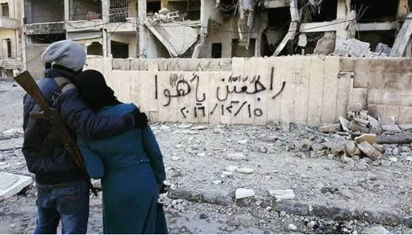 لقطة معبّرة يجتمع فيها الألم بالأمل.. مقاتل وزوجته؛ أجبرهم الاحتلال القرمطي المجوسي على الرحيل من مدينتهم(حلب)سنة 2016. وهما مغادران كتبا على جدار منزلهم المهدّم؛(راجعين). وبعد سنين من الصبر والمصابرة, جاء الفرج.