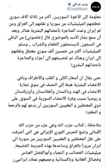 خلال حرب الإبادة على الشعب السوري, نشطت تجارة بيع الأعضاء البشرية للمعدومين والقتلى, حيث يتم استخراج(قطع الغيار), كما يُسمّونها, من الأجساد بعد الإعدام, وقبله أحيانا. فعند أحفاد القرامطة؛ التوحّش والإجرام ليس له حدود!!.