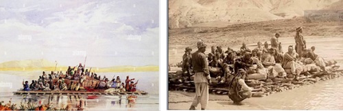 شكل 2: هذه صورة الكلك (كلكو) ويستعمل لنقل الركاب والبضائع لتعذر وجود وسائط نقل برية انذاك متوجهة من شمال العراق الى بغداد والبصرة، وتعود الصورة إلى عام (1918) ميلادية، وبقي الكلك يستخدم كواسطة نقل لغاية اربعينات القرن الماضي (اليمين)، صورة اخرى خيالية للكلك (كلكو) وما يحمله من بضائع ومسافرين (اليسار).