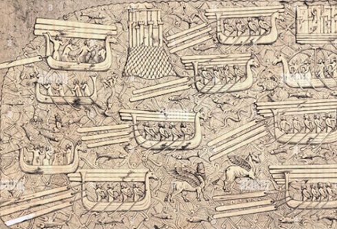 شكل 3: سفن آشورية تنقل الأخشاب الأرز (Cedar)، نقش بالنحت البارز من قصر سرجون (شروكين) (Sargon) في خرسباد (Khorsabad)، القرن الثامن قبل الميلاد.