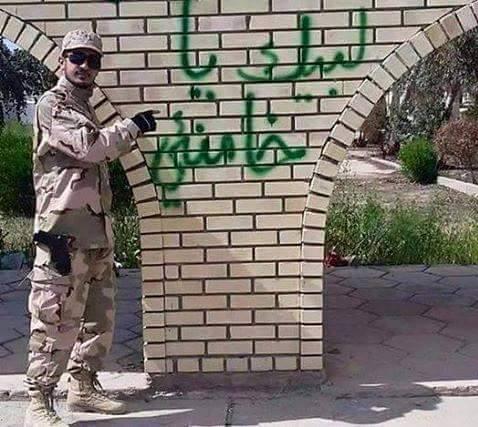 (لبيك يا خامنئي)!!.. يفتخر أحفاد القرامطة بالولاء لإيران ودجالها المجرم. ورغم إن هذه الحثالات ترتدي زي عسكري رسمي عراقي, فإن الحكومات الشيعية ووزاراتها المعنية تتجاهل هذه المشاهد المقززة, والتي تدحض فكرة وجود مؤسسة عسكرية وطنية من أساسها.